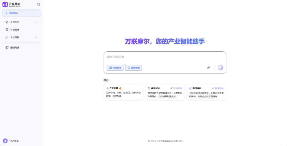 产业数据问答,解决“数据找不准、分析耗时长”痛点;AI研报创作,万联摩尔大模型可提供8类专业AI研报模板,采用分步式、可交互创作模式,产出高质量报告;价格预测功能,万联摩尔覆盖黑色、有色、建材、能源、农业等几十个品类,预测准确率达到90%以上;企业洞察功能,通过整合工商数据、经营动态等多方面信息,可自动生成包含财务健康度、供应链稳定性、市场竞争力等维度的分析报告,为企业提供全面且深入的分析。